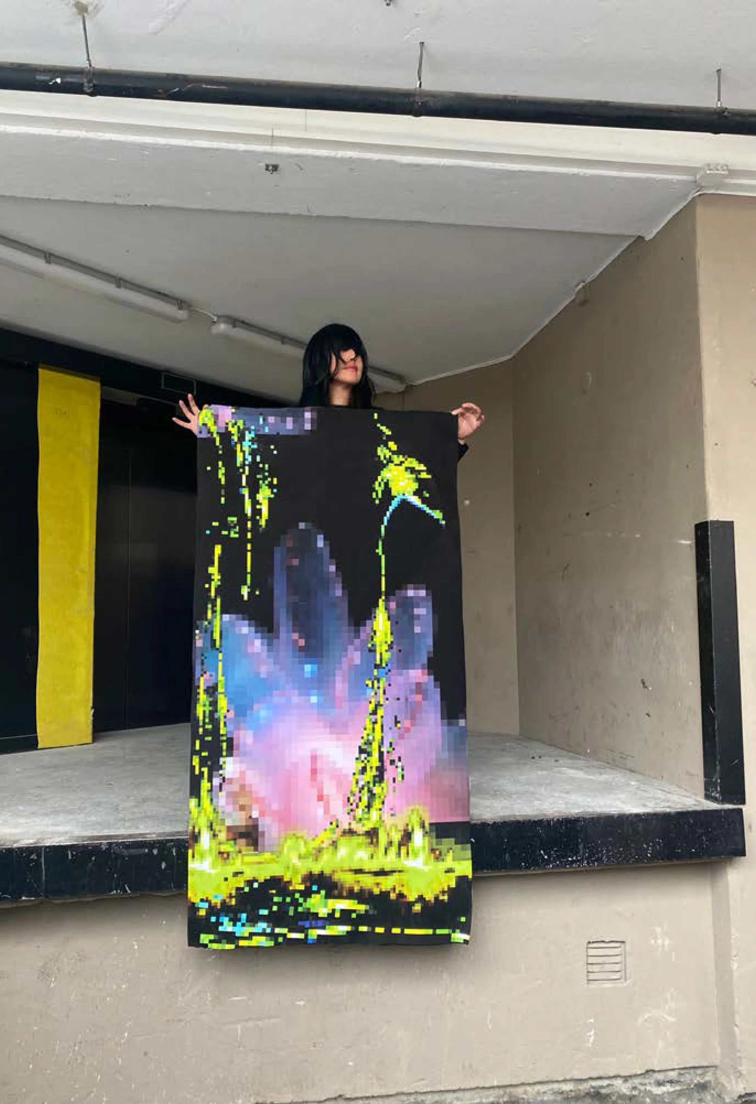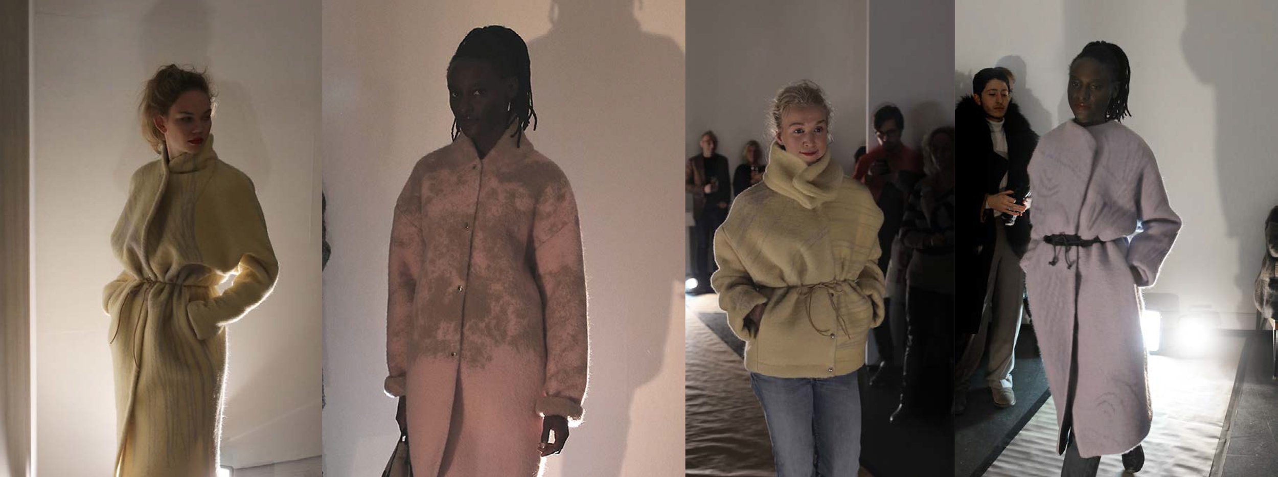 Det ble utviklet 4 tekstilprints, i 4 ulike farger. Printene ble vevd inn i ullen av Røros Tweed i deres tykkeste ullkvalitet fra Raumagarn. Jeg arbeidet ved fabrikken. Ullen ble tovet for å gi plagget en lodden karakter. Det ble arbeidet frem 14 ulike jakkemodeller, av visningens totalt 32 silhuetter Et tverrfaglig samarbeid mellom norsk design, kunst, håndverk, produksjon og råvarer.